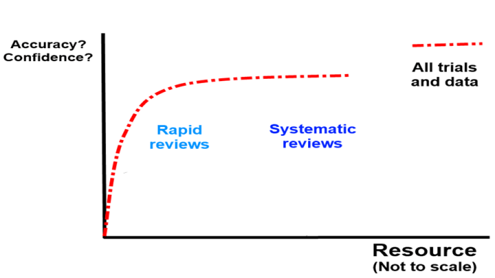 This post is not about Cochrane, but to raise a serious issue in relation to rapid reviews (RRs); well evidence synthesis generally: no synthesis can be viewed as the synthesis of all the evidence for an intervention – they are all samples of the total data. SRs typically take a bigger sample than RRs but that’s about it. I’ve tried to capture the continuum of evidence synthesis below: